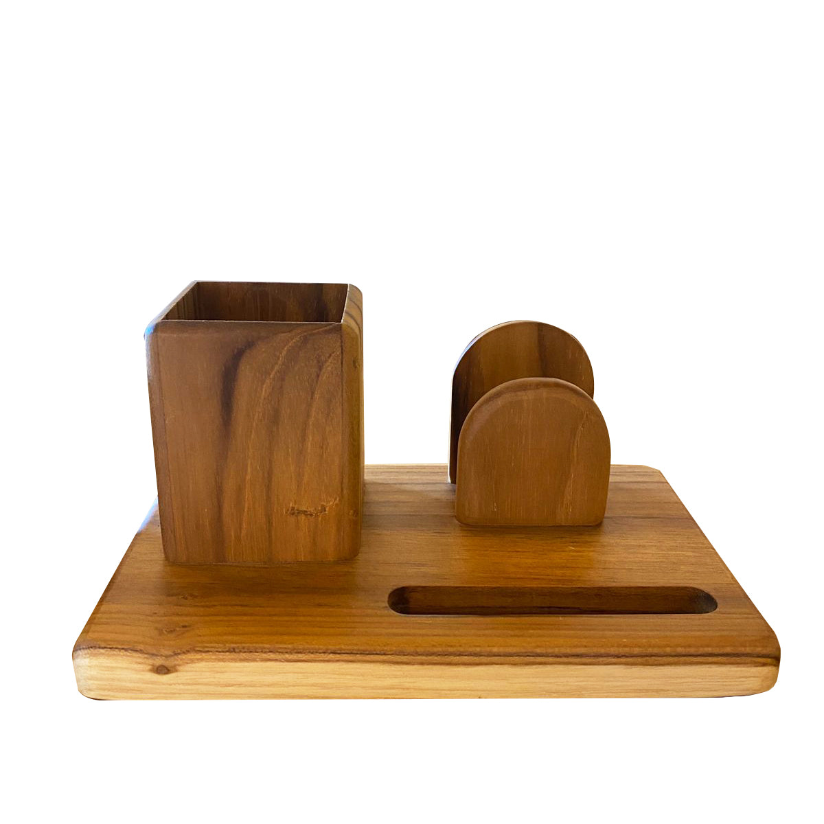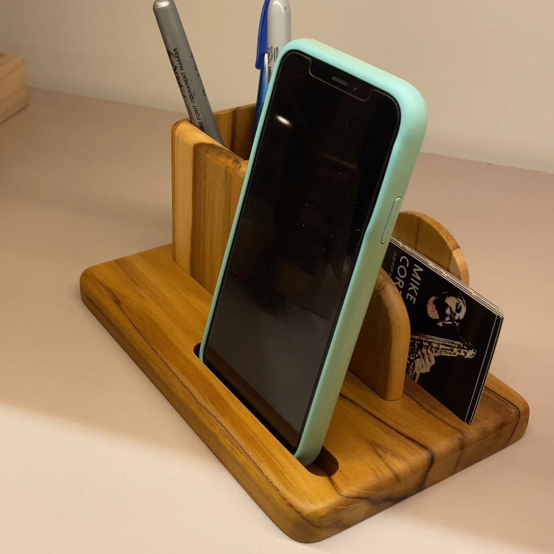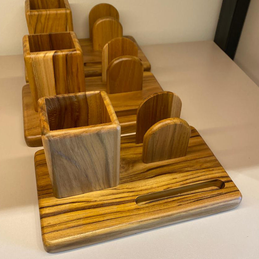 Portacelular multifuncional elaborado en madera de teca, combinando elegancia natural con practicidad. Diseñado para mantener tu teléfono seguro y visible, incluye compartimento integrado para lapiceros y espacio dedicado para tarjetas.